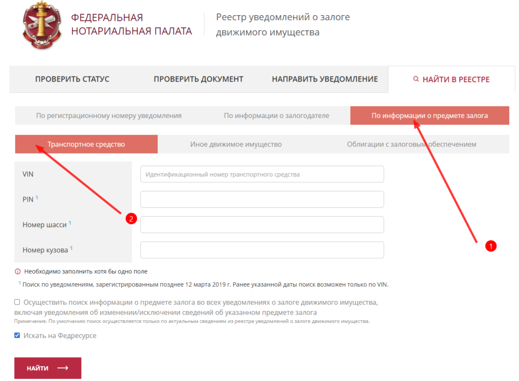 Выберите вкладку «По информации о предмете залога» → «Транспортное средство» → введите VIN.